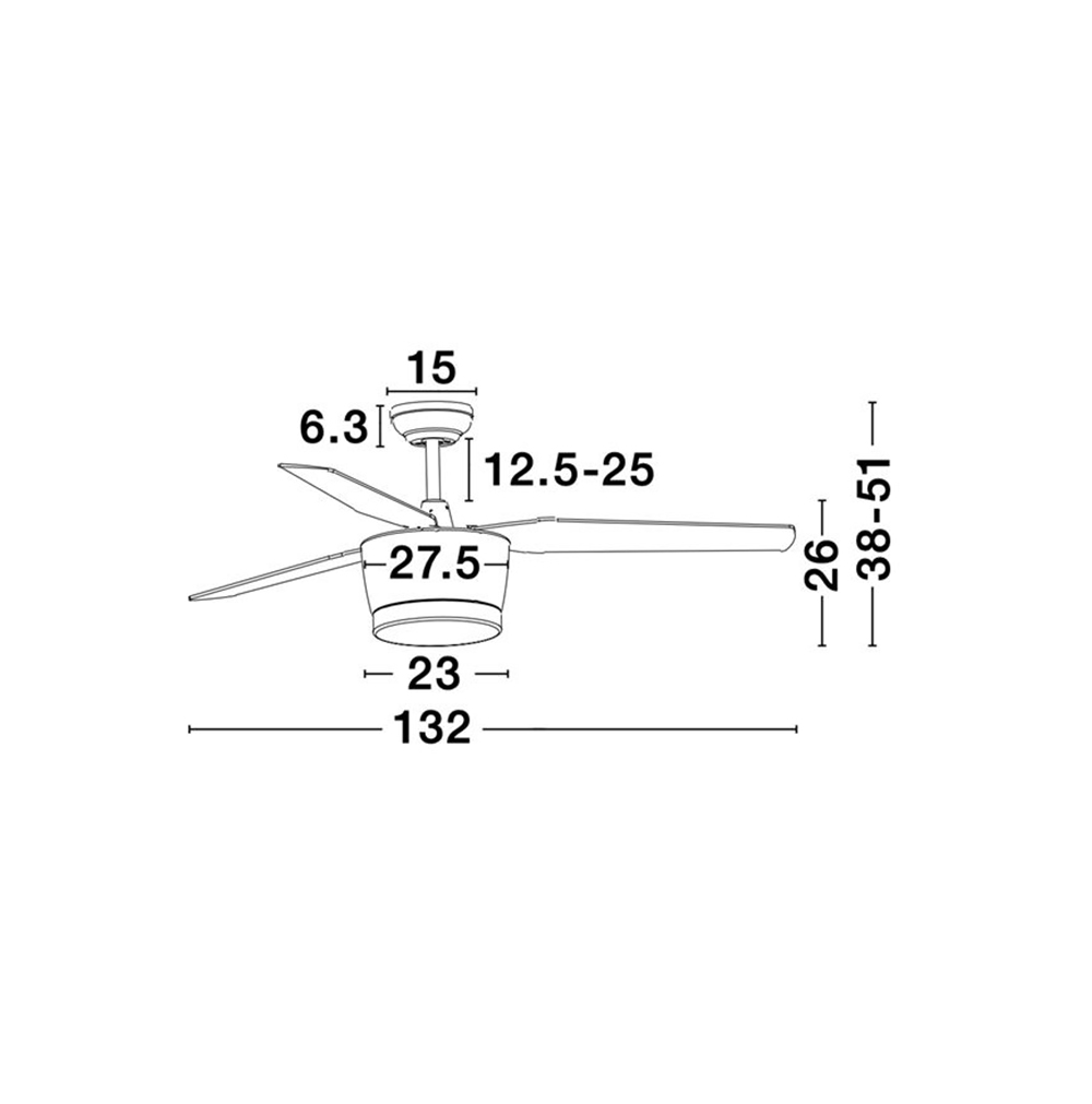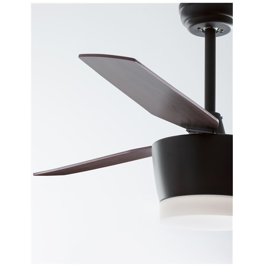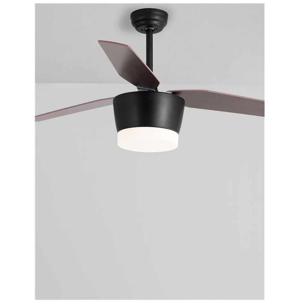 Ceiling fan with light, made of brown steel, wooden blades and glass