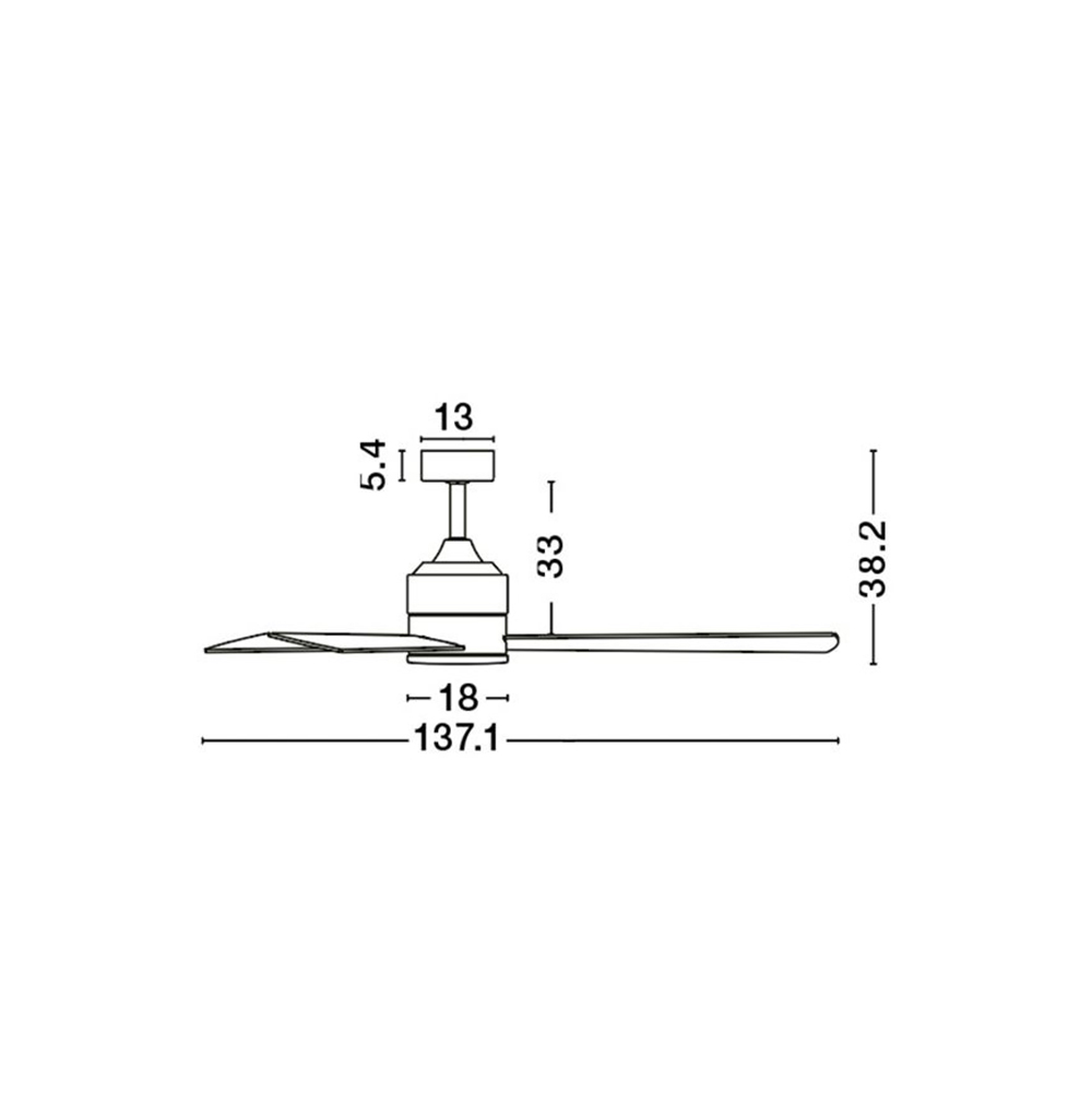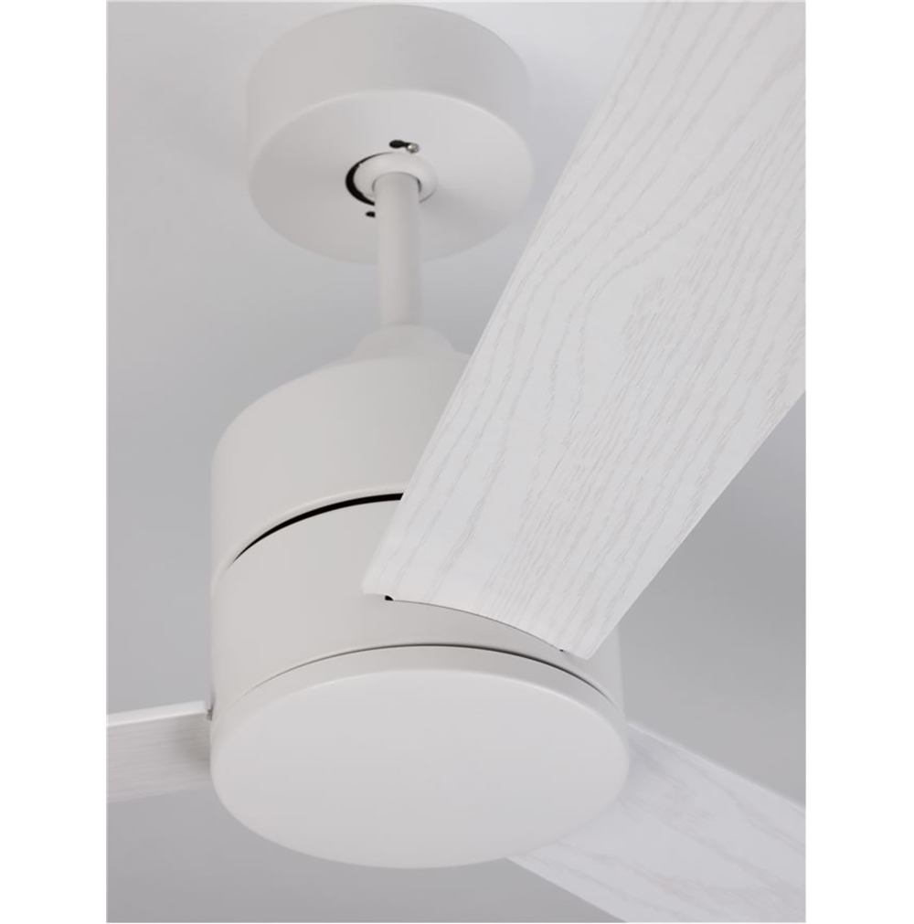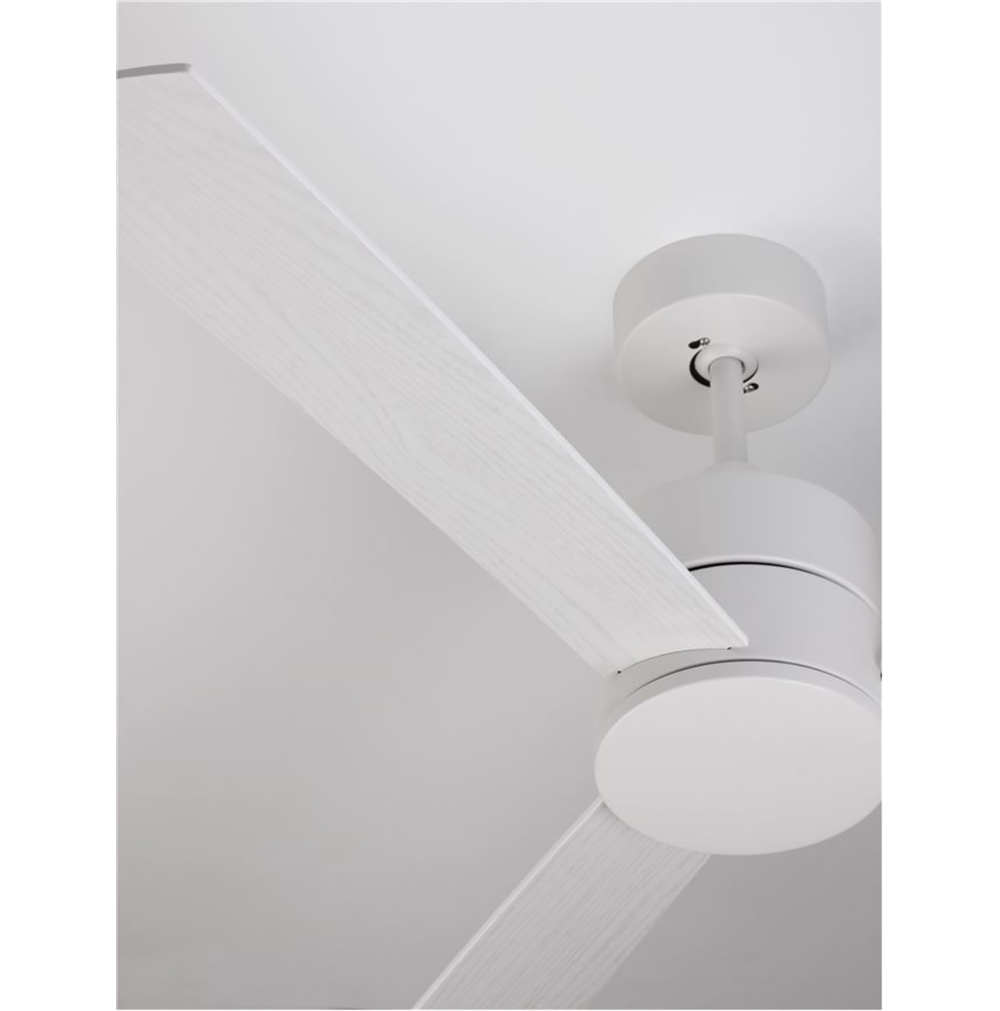 Ceiling fan with or without light, made of white aluminum, white wooden blades and glass.